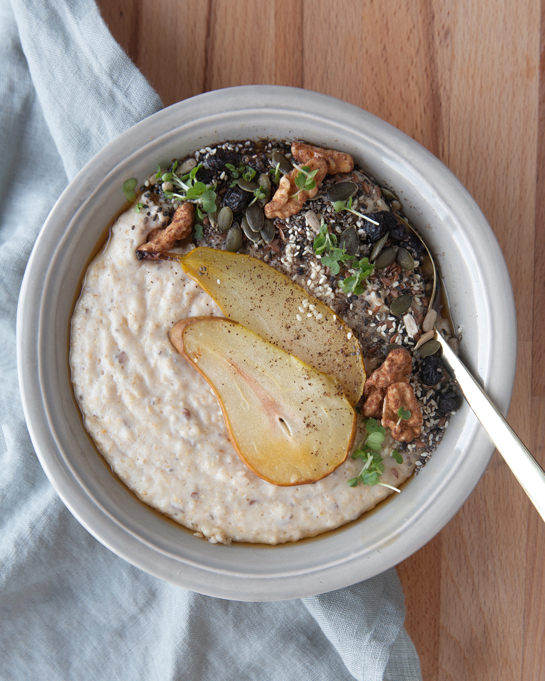 There is a something about pear and porridge that tastes to cosy. Makes me want curl up in a blanket under the air conditioner.